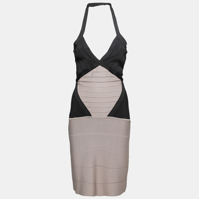 Herve Leger brings to you this fabulous colorblock dress suitable for all fashionable outings. Ingeniously crafted from knit bandages, the rayon blend dress features zip closure at the rear. Complementing pumps and a tote will automatically spice up your look.