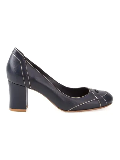 Navy blue leather pumps from Sarah Chofakian featuring a round toe, cut out details and a chunky high heel.