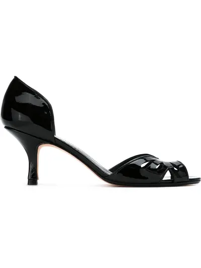 Black patent leather pumps from Sarah Chofakian featuring a mid high stiletto heel, cut out details, a peep toe and a leather sole.