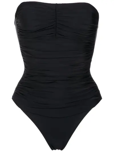 Black stretch-polyamide mesh strapless Melissa swimsuit from Lygia & Nanny featuring a strapless design top with removable cups, an internal elasticated pannel for added bra support, a removable strap, gathering effect that enhances the upper body, UPF 50+ satin-like fabric, an elasticated trimming, a lining and a fresh touch. This piece was created and produced carefully for you. Ensure this piece durability by following the inner tag washing instructions. Swimwear must be tried on over your own garments.