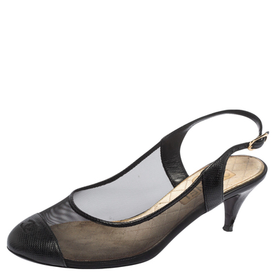 Chanel yet again brings a stunning set of sandals that makes us marvel at its beauty and craftsmanship. Crafted from mesh and exotic lizard in a black shade, they are secured with slingbacks and raised on sturdy heels. To finish off, the cap toes are adorned with iconic CC logos.