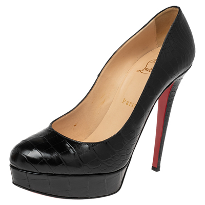 These Bianca pumps are an everlasting creation originating from the House of Christian Louboutin. The enthralling silhouette of these pumps is characterized by the black crocodile leather used on the exterior, their impressive shape, and the courageously lined red soles. They are elevated on slim heels, which adds a definitive touch to them.