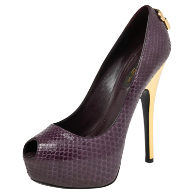 How splendid and glorious are these Oh Really pumps from Louis Vuitton Ravishing in purple, they come crafted from python leather and feature a peep toe silhouette. They flaunt an artistic engraved gold tone padlock detailing on the heel counters and come equipped with comfortable leather lined insoles, concealed platforms, and 14.5 cm heels. This is one pair you definitely need to get your hands on