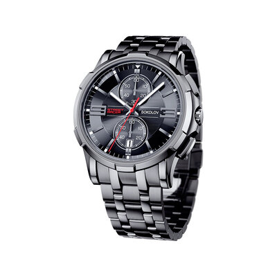 Баланс чётких линий и плавных изгибов массивного корпуса с усложнённым рантом раскрывает бескомпромиссный характер победителя. За безупречную работу модели отвечает японский кварцевый механизм. Для дополнительной влагозащиты в 5 АТМ задняя крышка корпуса фиксируется винтами. Под минеральным стеклом расположены счетчики хронографа, декорированные круговым узором и алмазной гравировкой. Совершенство радиусных накладных меток и гранённых стрелок подчёркивают матовое покрытие под часовой индикацией и сатинирование «солнечные лучи» – впечатляющая игра света. Для точного определения времени в темноте объёмная разметка и стрелки покрыты люмомассой. Фирменный логотип и название коллекции выполнены объёмной лаковой печатью. Вытянутые арабские цифры объединены двумя горизонтальными линиями. Завершают стремительный динамичный дизайн часов красная секундная стрелка и индикатор даты.