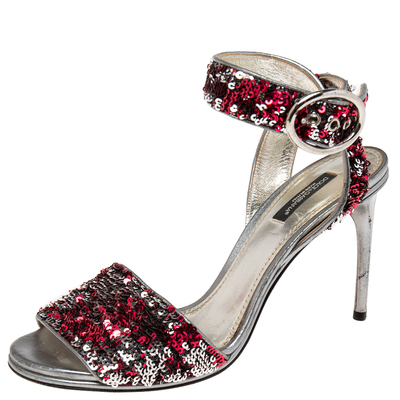 Walk with style and panache as you wear these gorgeous sandals from the House of Dolce and Gabbana. They are designed luxuriously using pink silver leather and sequins. They exhibit open toes, an ankle strap, and silver tone hardware. These stunning sandals are worth owning