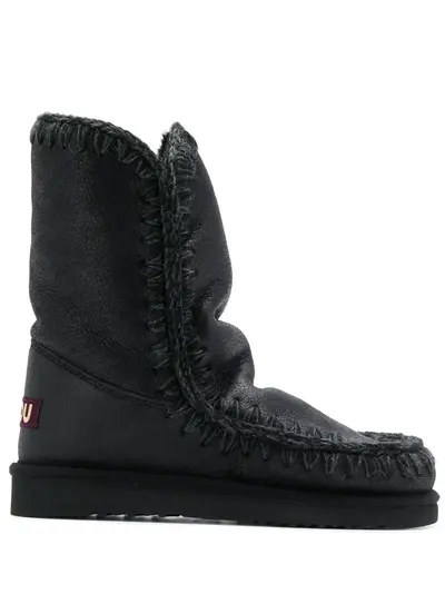 Black stitch detail snow boots from Mou featuring a round toe, a pull-on style, branded heel counter and a flat rubber sole.
