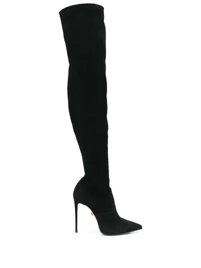 Black suede leather Eva stretch boots from Le Silla featuring a pointed toe, over the knee length, a stretch fit and a high heel.