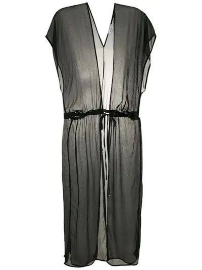 Black; open front; short sleeves; drawstring fastening waist; loose fit.