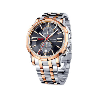 Стальной хронограф с позолоченными рантом и звеньями, чёрным циферблатом дополнит деловой костюм или кэжуал образ. Твоя жизнь, твои правила!