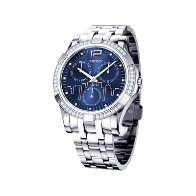 За безупречный функционал хронографа отвечает японский кварцевый механизм. Для дополнительной влагозащиты в 5 АТМ задняя крышка корпуса фиксируется винтами. Сложный рант, декорированный фианитами, и многофункциональный циферблат придают часам динамичный вид. В металлизированный стикер – силуэт города – включена секундная шкала. Счётчики хронографа органично вписываются в композицию. Радиусные накладные знаки часовых меток и крупная цифра 12 – в минутную шкалу. Их совершенство раскрывается благодаря матовому покрытию под разметкой и сатинированию «солнечные лучи» – впечатляющая игра света.