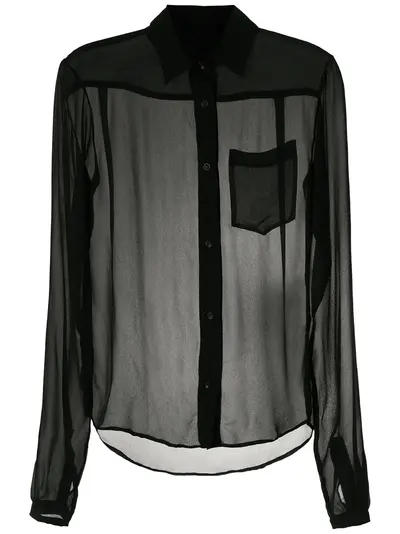 Black silk shirt from Amir Slama featuring a classic collar, a front button fastening, long sleeves, a sheer construction, a curved hem, a chest pocket, a relaxed fit and a straight fit.