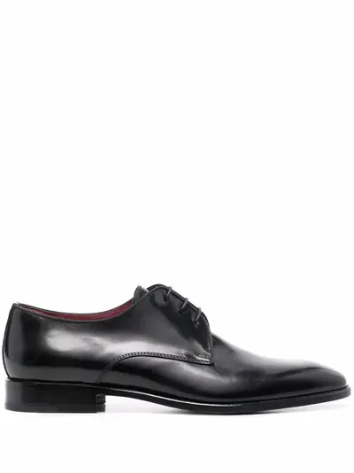 black leather high-shine finish tonal design almond toe front lace-up fastening branded leather insole flat leather sole
