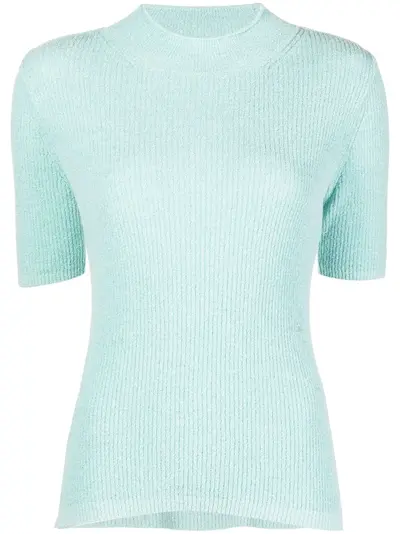 mint green cotton blend ribbed knit roll neck short sleeves straight hem