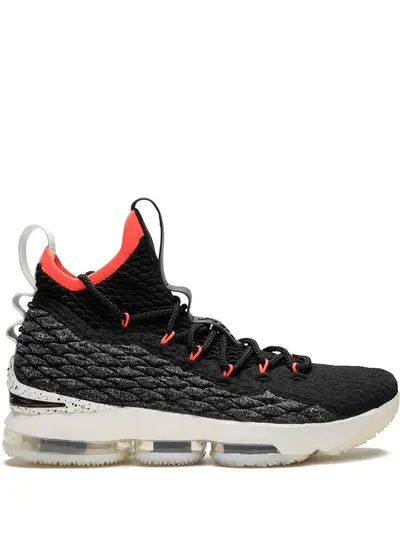 Black and red Lebron 15 sneakers from Nike featuring a round toe, an oversize tongue, a pull tab at the rear and a ridged rubber sole. Supplied by a premier sneaker marketplace dealing with unworn, already sold out, in demand rarities. Each product is rigorously inspected by experienced experts guaranteeing authenticity.
