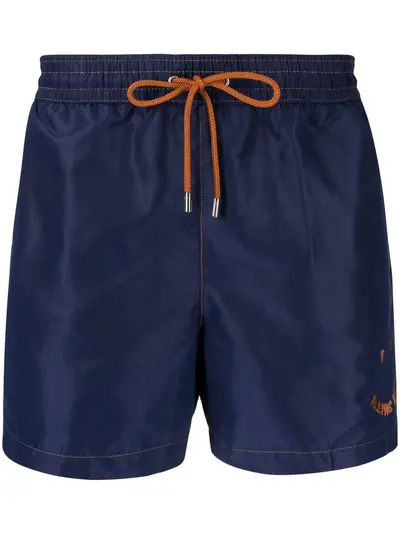 blue recycled polyester logo print at the leg contrast stitching elasticated drawstring waistband rear patch pocket Be mindful to try on swimwear over your own garments.