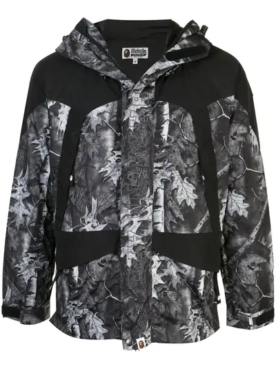The A Bathing Ape Forest Camo Snowboard Jacket is influenced by the brand’s affinity for military design. A black-and-white forest camouflage is featured prominently across the hooded jacket with black accents for the pockets, chest, and hood. A branded, white rubber patch is affixed to the upper left sleeve and subtle Bape logos are seen throughout. The jacket is designed to help snowboarders and skiers perform their best on the slopes. Or, it can be worn for lifestyle purposes.