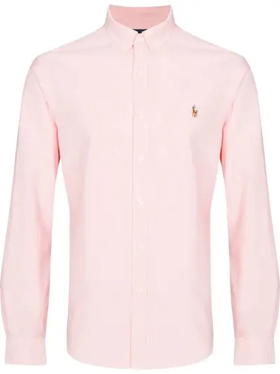 pink cotton classic collar front button fastening signature Polo Pony motif long sleeves buttoned cuffs curved hem