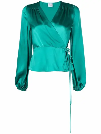 green silk tied waist V-neck long sleeves