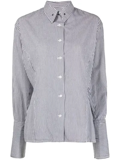 1990s stripe-print shirt from Jean Paul Gaultier Pre-Owned featuring grey/white, cotton, vertical stripe print, buttoned cuffs, long sleeves, straight-point collar, front button fastening and circa 1990s. .