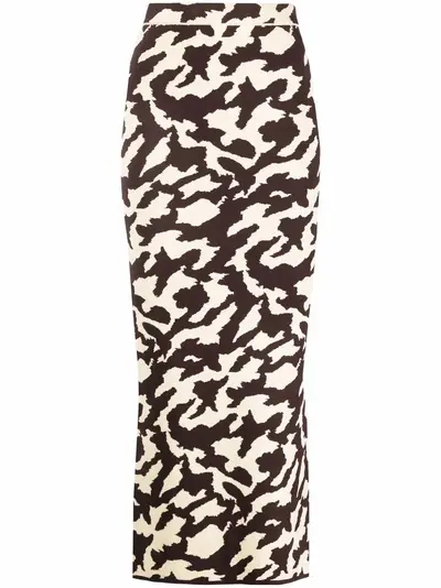 ivory white/brown virgin wool stretch-design fine knit animal print high waist side slits mid-length straight hem