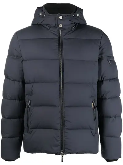 long sleeve padded jacket from MOORER featuring padded design, down-feather filling, front zip fastening, front zip fastening pockets, straight hem, navy blue, classic hood and long sleeves.