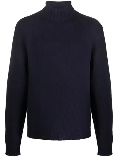 logo-knit roll-neck jumper from PALM ANGELS featuring navy blue, white, wool blend, intarsia-knit logo, knitted construction, roll neck, long sleeves, ribbed cuffs and ribbed hem.