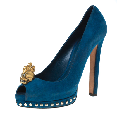 If youre someone who has a love for things that are edgy and unique, then Alexander McQueens designs are perfect for you. These McQueen pumps are anything but dull. Luxuriously crafted from suede, they feature gold tone skull motifs over the peep toes, round studs on the platforms and 14 cm heels. Have all eyes on you while you go around in this pair.