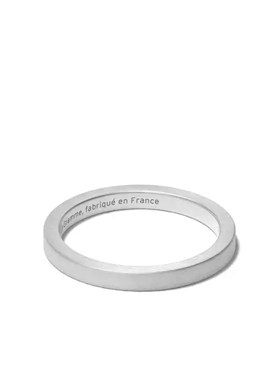 Sterling silver Le 3 Grammes ribbon ring from Le Gramme featuring a brushed finish, an engraved slogan and metal weight detail and a flat style. Please note this item is unisex and sold in men's sizing.