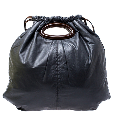 This wonderful Marni design is made from Nappa leather flaunting a dark grey shade. The bag has a slouchy shape with a drawstring closure that secures the nylon interior. It is complete with a shoulder strap and an in built handle cutout.