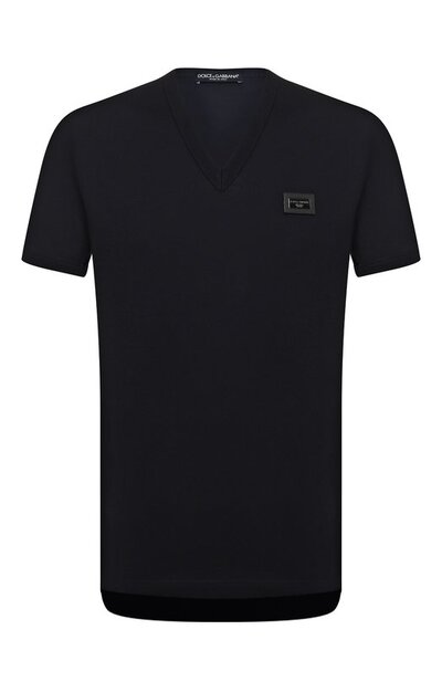 Темно-синяя футболка сшита из тонкого хлопкового джерси, поэтому она легкая, мягкая и хорошо пропускает воздух. Изделие украшено небольшой металлической планкой с гравировкой в виде логотипа марки. Доменико Дольче и Стефано Габбана включили модель в коллекцию сезона весна-лето.