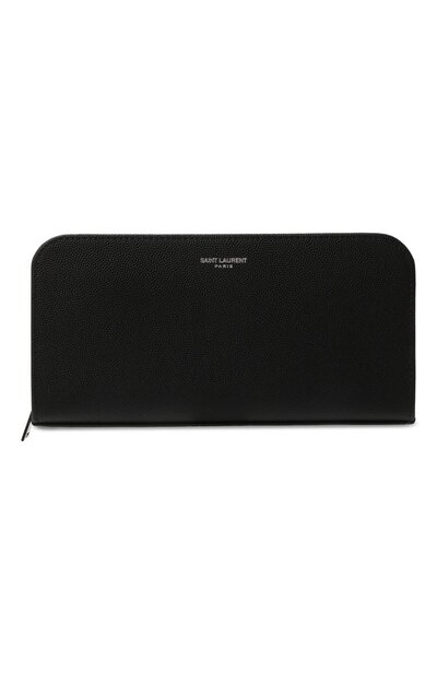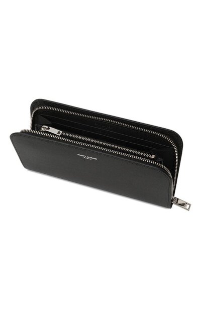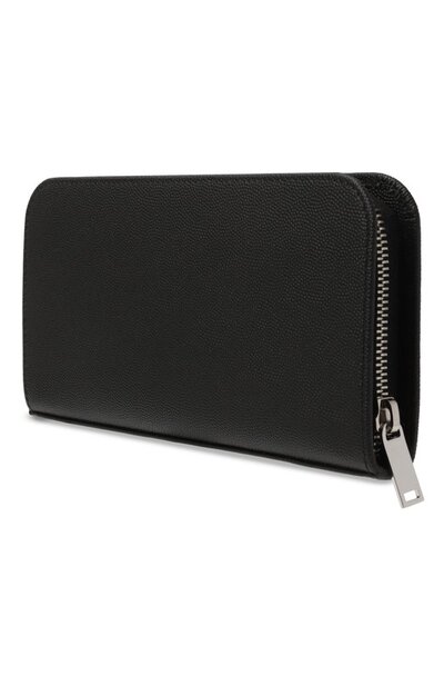 Мастера бренда изготовили черное портмоне из зернистой матовой кожи. Внутри – два отделения для купюр, разделенные карманом для монет, и 12 слотов для кредитных карт. Аксессуар, украшенный серебристым тисненым логотипом марки, застегивается молнией.