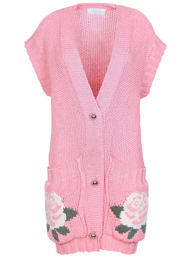 -Жилет удлиненный хлопковый крупной вязки от TAK.ORI. -Короткие рукава с манжетами, эластичный пояс, крупные накладные карманы с принтом в виде цветов. -V-образный вырез горловины, застежка – декоративные пуговицы.