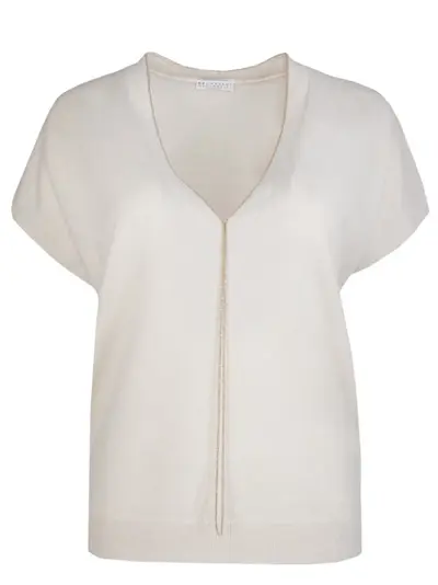 -Кашемировый топ от Brunello Cucinelli. -V-вырез горловины, короткий рукав, прямой крой.