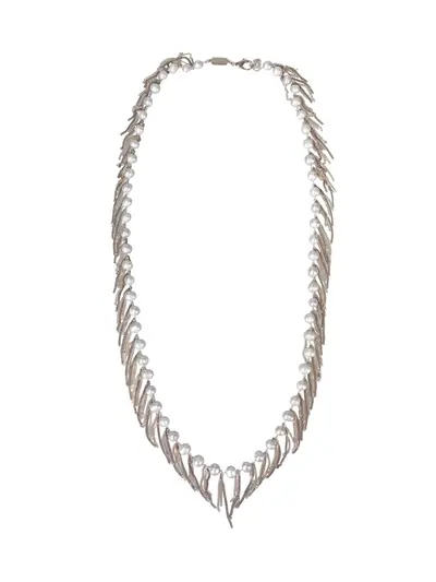 -Модель выполнена в виде цепей из мелких звеньев серебристого цвета, украшена круглыми жемчужными бусинами.