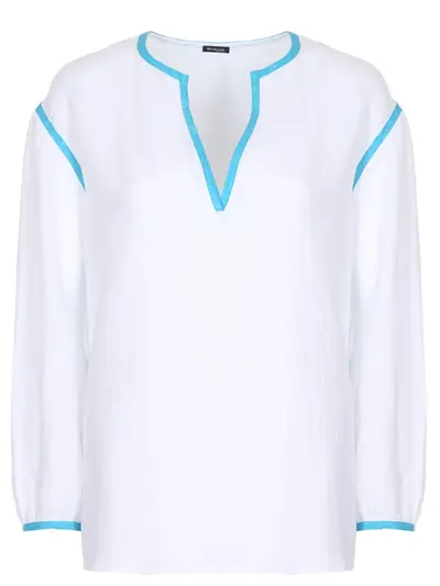 -Свободный прямой крой, спущенная линия плеча, длинные рукава, V-образный вырез на груди, круглый вырез горловины, боковые разрезы, контрастная отделка деталей.