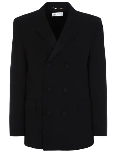 -Черный двубортный пиджак из шерсти от SAINT LAURENT.
