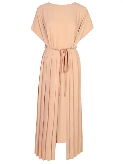 -Длина миди асимметричного кроя, вырез-лодочка, спущенная линия плеч, короткие рукава, подвижная плиссированная вставка на кулиске.