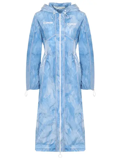 -Голубой с принтом плащ от OFF-WHITE. -Прямой крой длины миди, приталенный кулиской на поясе, длинные рукава, манжеты на кулиске, капюшон на кулиске, застежка-молния, логотипы на груди.