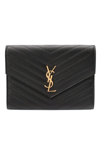 Черный кошелек выполнили из мягкой текстурной кожи со стеганым шевронным мотивом. Аксессуар закрывается треугольным клапаном, декорированным знаковой монограммой Кассандра из инициалов Ива Сен-Лорана. Модель дополнили короткой съемной ручкой-петлей в тон.