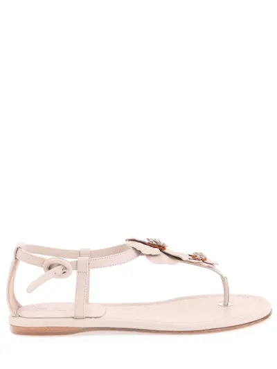 -Сандалии из мягкой кожи "Flowered" в пудровом оттенке от Loro Piana. -Модель декорирована цветочными аппликациями. -Застежка - пряжка. Товар доступен в бутиках, дополнительная информация по номеру 8 800 333 49 29.