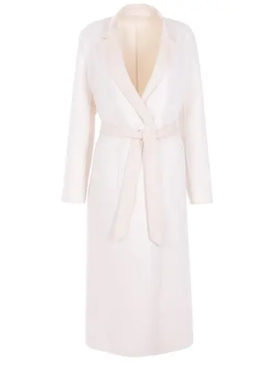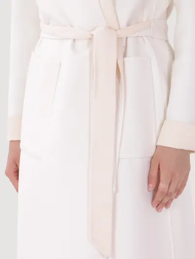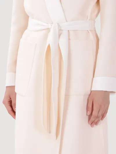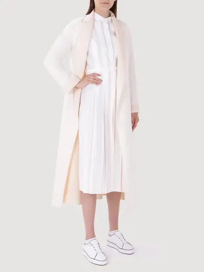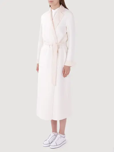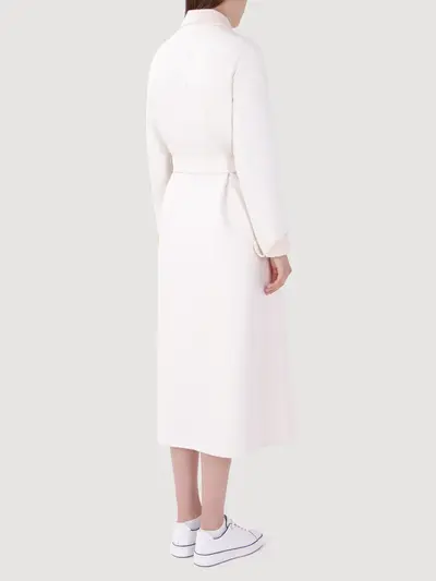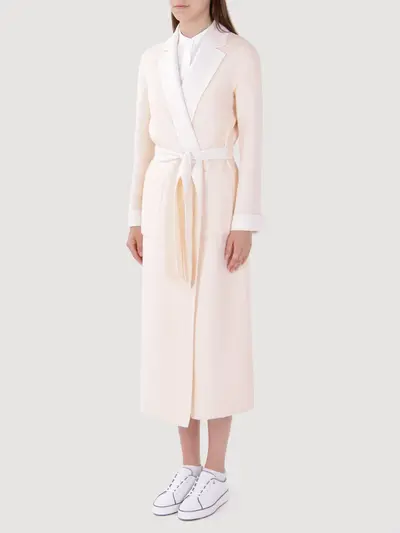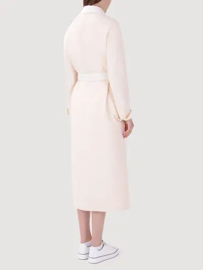 -Пальто облегченное из кашемира двустороннее от LORO PIANA.-Длина макси, отложной ворот, лацканы, длинные рукава, крупные накладные карманы, свободный запах пол, пояс. Товар доступен в бутиках, дополнительная информация по номеру 8 800 333 49 29.