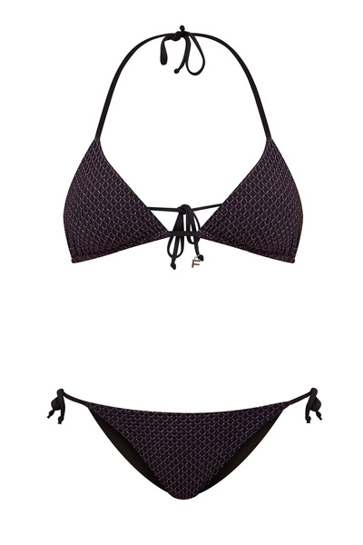 Минималистичный лиф-бикини с раздвижными треугольными чашечками от Fisico выполнен в лаконичном черном цвете. Для создания модели был выбран эластичный трикотаж на основе нейлона — быстросохнущего материала, стойкого к хлору и выцветанию. Изделие дополнено фактурным узором, выполненным в технике плетения. Прострочка серебристой нитью с металлическим блеском придает образу оригинальный акцент. Тонкие двойные завязки на спинке позволяют регулировать силуэт индивидуально.