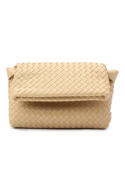 В Bottega Veneta уважают художественные ремесла, поэтому светло-бежевую сумку BV Fold из коллекции сезона осень-зима выполнили вручную в старинной технике плетения intrecciato из узких полос гладкой мягкой наппы. Чтобы придать материалу легкий полуматовый блеск, его предварительно разутюжили. Внутрь поместятся кошелек и смартфон.