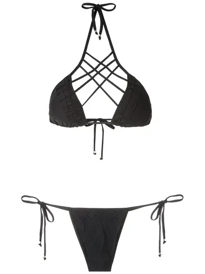 Black strappy triangle bikini set from Amir Slama featuring a triangle top with crossover straps to the front, a removable bra support, a back tie fastening, and a side tie fastenings bottom with an elasticated trim, a lining and a stretch fabric with fresh touch.