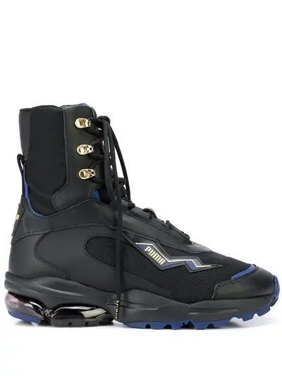 Black leather x Balmain Cell Stellar high-top sneakers from Puma featuring a round toe, a lace-up front fastening, eyelets, a logo patch at the tongue, a pull tab at the rear and branded heel counter.