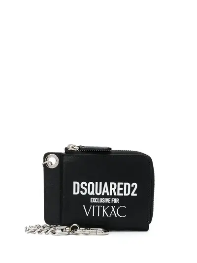 Black and white calf leather Exclusive for Vitkac wallet from DSQUARED2 featuring a printed logo to the front, a chain link strap, a zip fastening, multiple interior card slots and silver-tone hardware. Please note this is an exclusive piece.