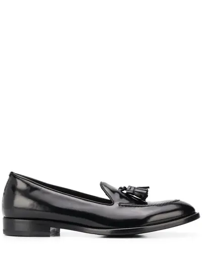 Black calf leather Sienna loafers from Scarosso featuring a slip-on style, a round toe, a flat sole, a branded insole and tassel detailing.