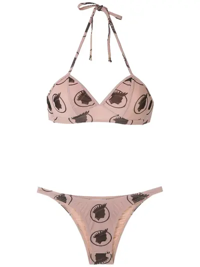 Nude printed bikini set from Amir Slama featuring a top with spaghetti straps, a panelled design for added support, a back tie fastening, a brazilian style bottom with a high cut leg, a lining, an all-over print, an elasticated trim and a mid-weight stretch fabric. This item is true to fit. Please note the print may differ slightly from the item pictured. Swimwear must be tried on over your own garments. This item provides a low body coverage. We recomend buying the next size up for bigger breasts sizes.