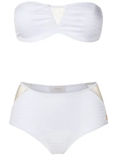 White Jade high waisted bikini set from Brigitte featuring a bandeau top with a removable bra support, a post back closure, a high waisted style bottom with an elasticated trim, a lining and a mid-weight stretch fabric with a fresh touch. This item is true to fit. Swimwear must be tried on over your own garments. We recommend buying the next size up for bigger bust sizes.