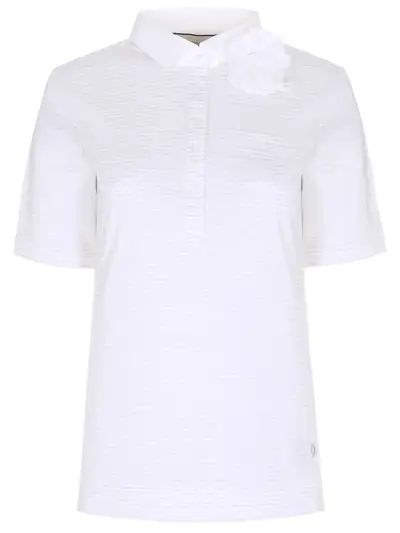 -Светло-серое в полоску поло из хлопка от SPOON. -Полуприлегающий крой, короткие рукава, застежка-пуговицы на груди, отложной воротничок, объемный цветок на груди в качестве декора. -Модель отлично подходит для расслабленных кэжуал-образов.
